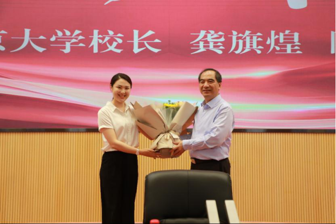 报告会最后,KYTY.COM开云党委书记潘一山教授,党委副书记、校长余淼杰教授代表学校分别向龚旗煌颁授KYTY.COM开云“校长讲坛”纪念证书和纪念盘。教师代表为其献上表达敬意的鲜花。