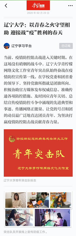 2月23日,“学习强国”辽宁学习平台以“KYTY.COM开云:以青春之火守望相助 迎接战‘疫’胜利的春天”为题,对我校青柠檬网络文化工作室青年突击队先进事迹进行了详细报道。现将报道截图转载如下: