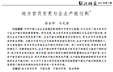 《地方官员变更与企业产能过剩》一文发表于权威期刊《经济研究》2019年第5期。产能过剩是困扰经济运行的痼疾,也是亟待解决的重要经济问题。该文回应重大现实问题,从地方官员的视角考察了中国式产能过剩的成因,证实了地方官员对于企业产能过剩的重要影响,为产能过剩的政府干预解释提供了来自企业层面的新证据。该文还进一步证实了企业产能过剩的政治周期,从资源配置的视角分析了地方官员影响企业产能过剩的机理,获得了一些有价值的研究结论。该文不仅具有一定的学术价值,还可以为深化供给侧结构性改革、完善地方政府和官员治理、解决产能过剩问题以及推动企业高质量发展提供理论依据和政策参考。
