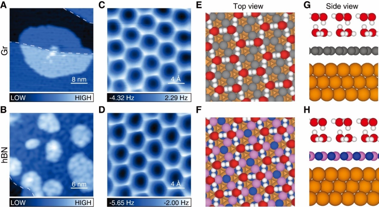 图1. 铜表面单层石墨烯和六方氮化硼上的二维冰结构。(A和B)石墨烯和氮化硼表面二维冰的STM图。(C和D)石墨烯和氮化硼表面二维冰晶格的AFM图。(E到H)石墨烯和氮化硼表面二维冰的模型图。