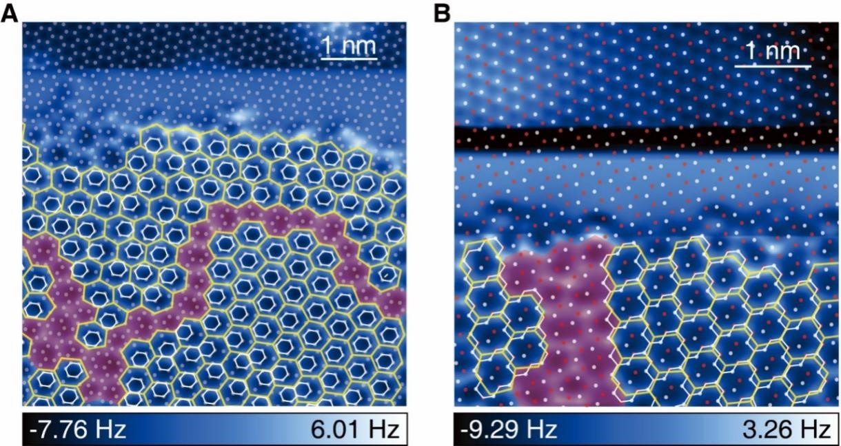 图2. 石墨烯和氮化硼晶格与二维冰晶格的公度关系。(A)二维冰与石墨烯晶格的不公度匹配,灰点表示石墨烯衬底中的碳原子的位置,黄色和白色六元环分别表示二维冰的水六元环和石墨烯的碳六元环。(B)二维冰与氮化硼晶格的公度匹配,白点和灰点分别表示氮化硼衬底中的硼原子和氮原子的位置,黄色六元环和白色十四边形分别表示二维冰的水六元环和氮化硼的硼-氮十四边形。
