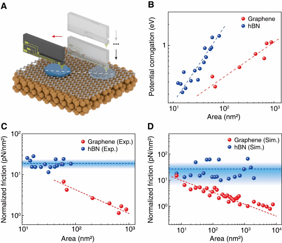图3. 利用针尖操控测量二维冰与衬底间的摩擦力。(A)针尖操纵二维冰滑动示意图。(B)两个表面上水-针尖相互作用势能起伏与二维冰面积的关系。(C)实验所得二维冰在两个表面上的本征归一化静摩擦力。(D)分子动力学模拟所得二维冰在两个表面上的本征归一化静摩擦力。