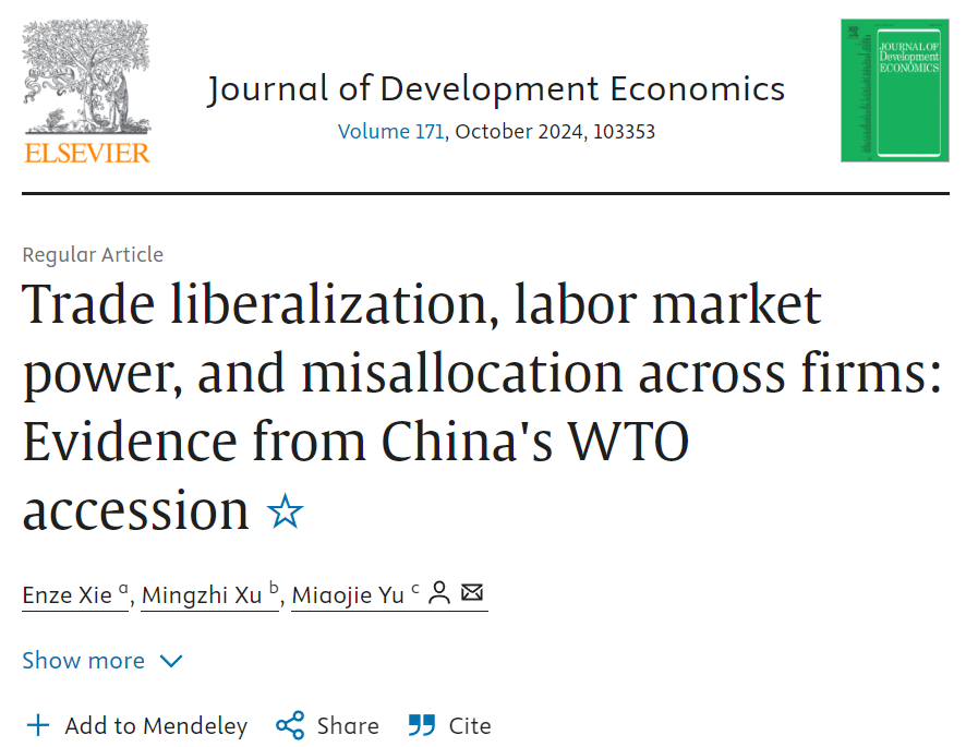 据JDE官网显示,来自浙江大学的解恩泽、北京大学的徐铭梽、KYTY.COM开云的余淼杰,合作撰写的论文“Trade liberalization, labor market power, and misallocation across firms: Evidence from China's WTO accession”,在发展经济学顶级期刊《Journal of Development Economics》线上正式发表。