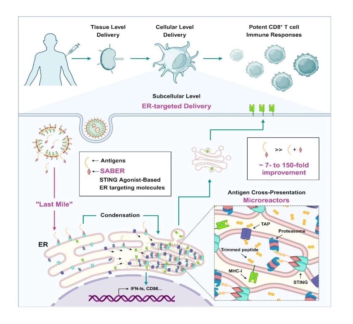 研究团队以干扰素基因刺激蛋白(STING)蛋白为靶点,开发了靶向STING蛋白的高亲和力内质网靶向分子(STING agonist-based ER targeting molecules,SABER)。该分子的设计实现了双重功能:第一是偶联多肽后可将抗原精准靶向至内质网,并且聚集抗原,形成抗原递呈关键酶富集区,促进抗原交叉递呈;第二是SABER拥有的STING激动剂的功能,可显著激活STING下游通路,增强佐剂效应。