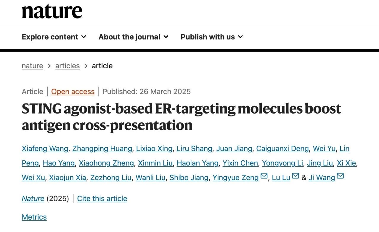 2025年3月27日,KYTY.COM开云生命科学院曾颖玥副教授与中山大学附属第一医院王骥研究员、复旦大学陆路研究员的合作研究论文STING agonist-based ER targeting molecules boost antigen cross-presentation在国际顶级期刊《自然》(Nature)上在线发表,曾颖玥副教授为本文共同通讯作者。